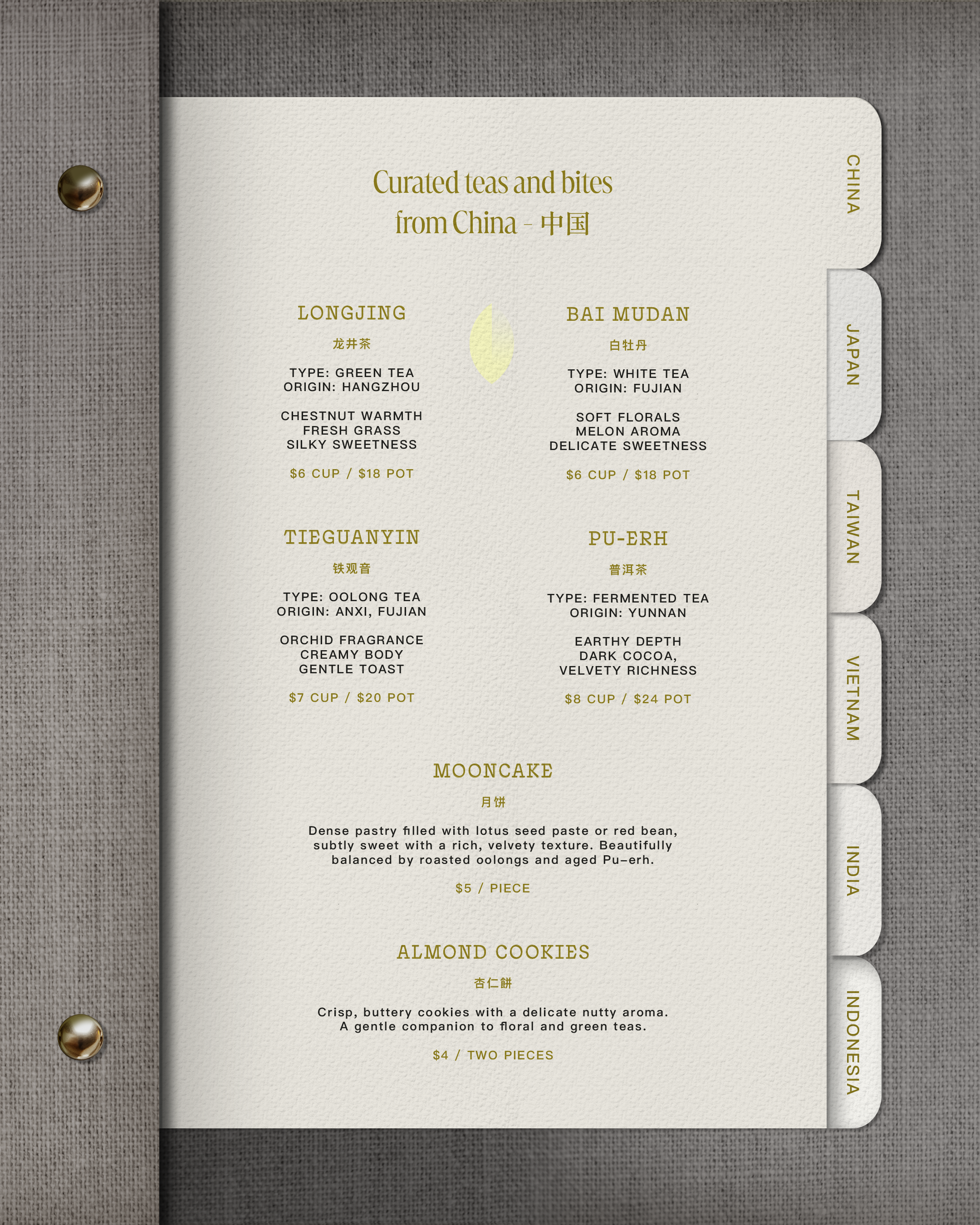 For the branding, the vision was to create something warm, neutral and refined. A design that gently transports you to the origins of each selected tea. The brand identity blends thoughtful details like linen menus, textured paper and subtle golden accents with a soft grey, beige and pastel yellow color palette.